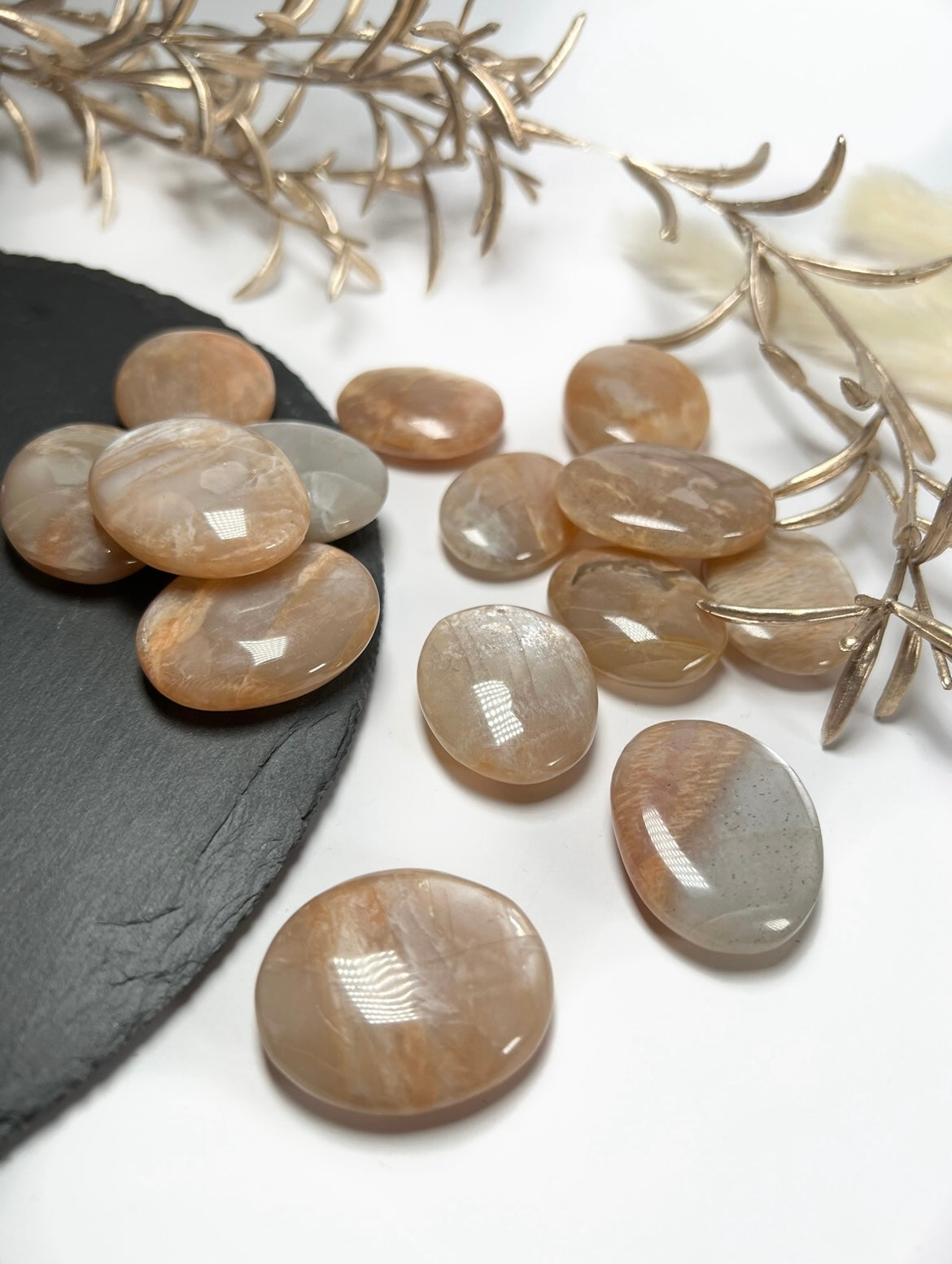 Diese wunderschönen Trommelsteine aus Mondstein zeichnen sich besonders durch ihre hohe Qualität aus. Jeder einzelne hat einen tollen Flash. Es kann auch Sonnenstein enthalten sein. Der Stein wird intuitiv für dich ausgewählt.