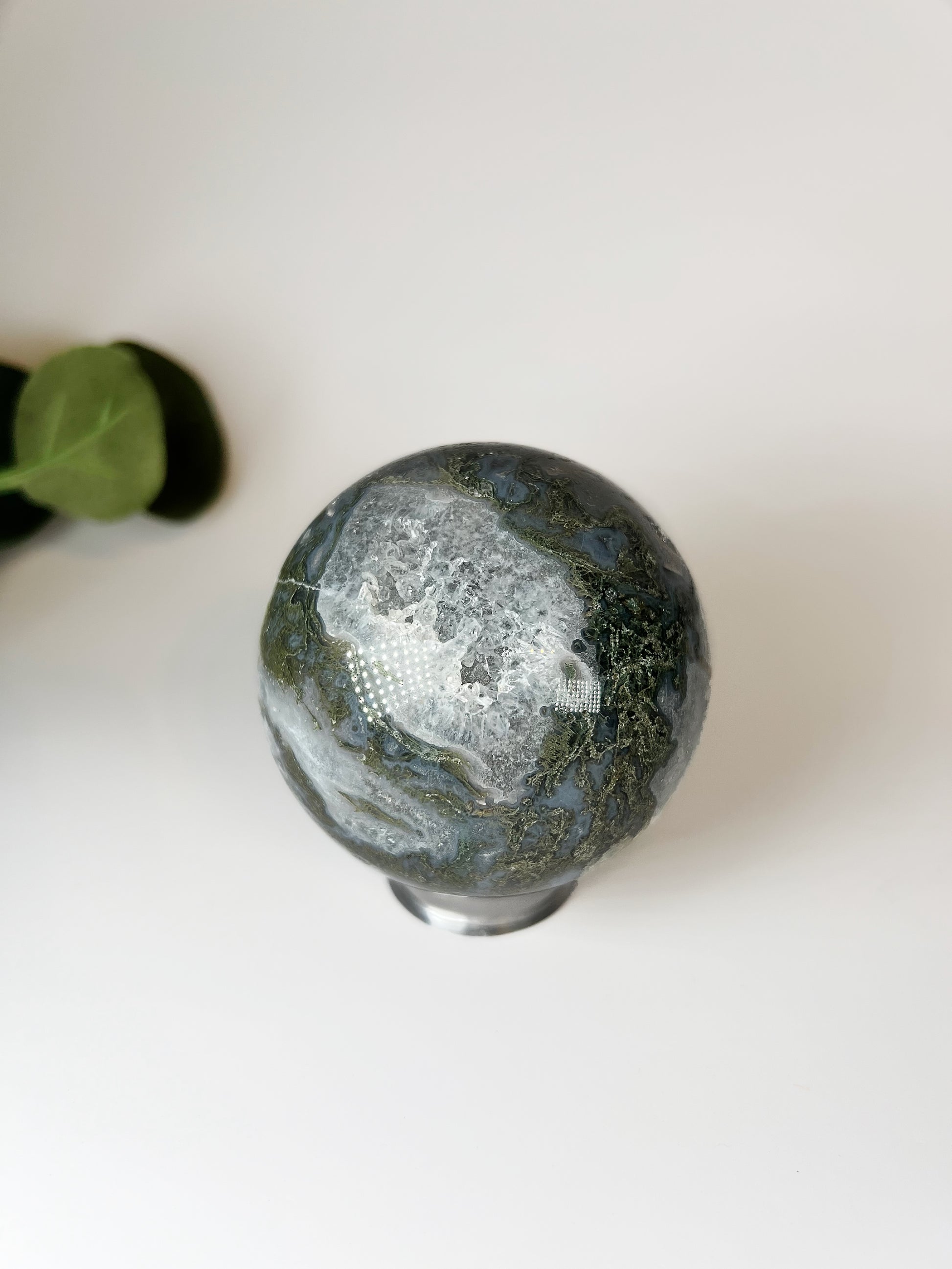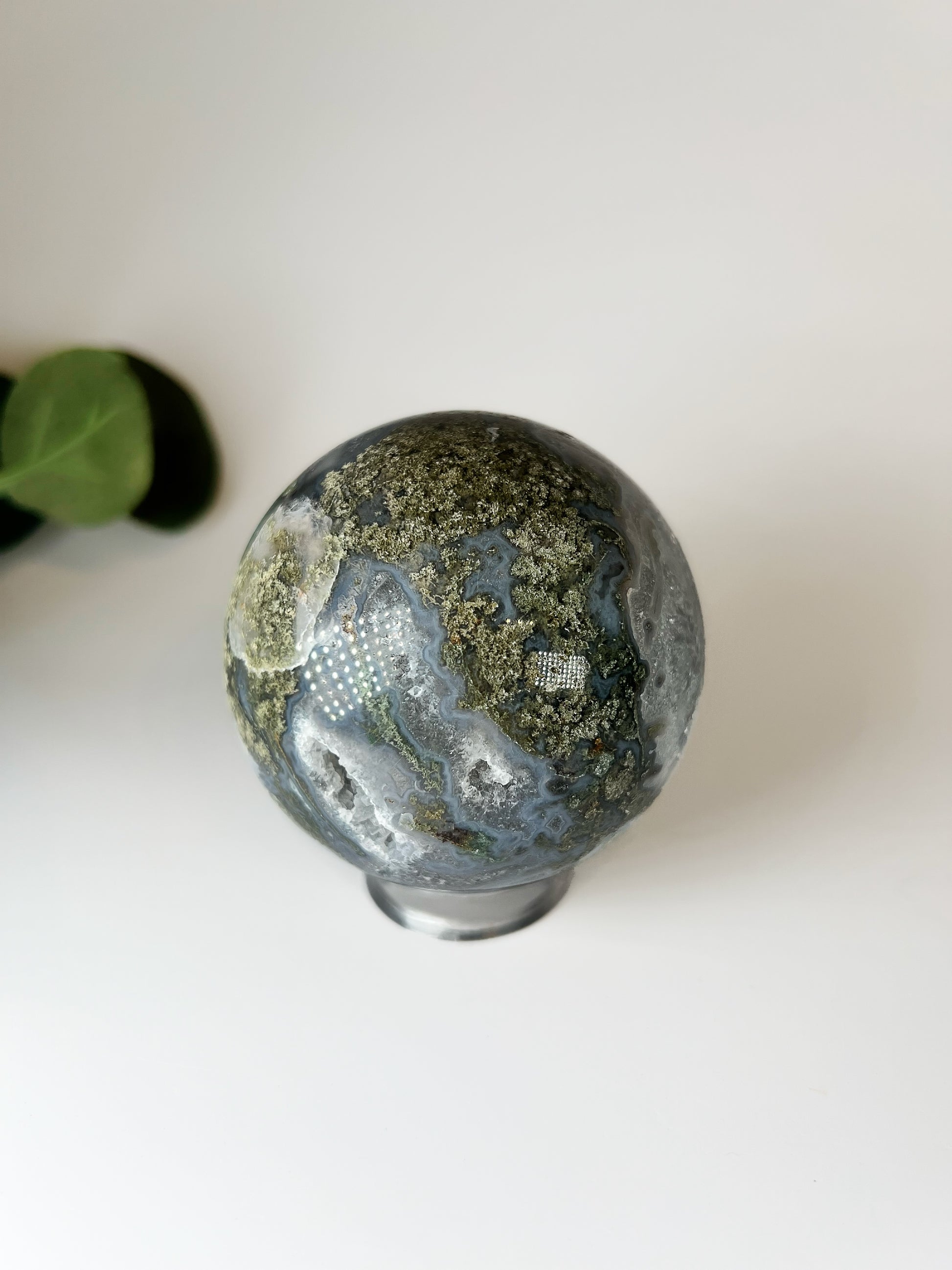 Diese Kugel hat glitzernde Quarzdrusen und ein unheimlich schönes Muster